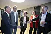 Arbeidslivsdirektør Tor Arne Gangsø (t.v.) i KS hilser på forhandlingsleder Geir Røsvoll i Unio kommune. Bak står fra venstre: forhandlingsleder Trond Ellefsen i YS Kommune, forhandlingsleder Helene Harsvik Skeibrok i LO Kommune og forhandlingsleder Tonje Leborg i Akademikerne Kommune.