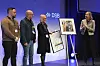 Delegasjonen fra Nesseby tar imot Samfunnssikkerhetsprisen fra Elisabeth Aarsæther (t.h), direktør i DSB. Fra venstre beredskapsrådgiver Nemanja Radisevic, kommunedirektør Charles Pettersson og ordfører Berit Ranveig Nilssen.