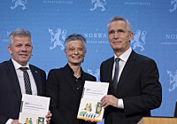 Kommunal- og distriktsminister Bjørnar Skjæran (Ap) og finansminister Jens Stoltenberg (Ap) tok imot kommunekommisjonens første rapport fra medlem Signy Vabo.
